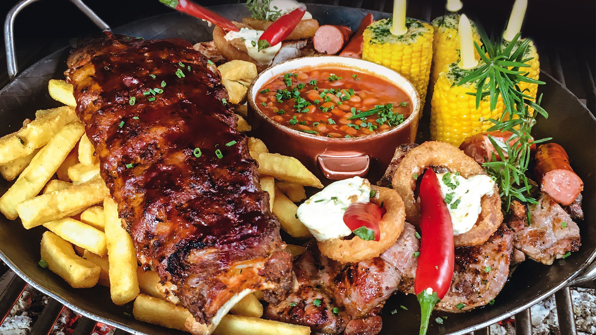 Ran an die Pfanne: Steaks, Spareribs, Baked Beans und Steakhouse-Pommes für bis zu 4 Personen in gußeiserener Pfanne serviert und rustikal genießen. Röstaromen und Country-Feeling liegen in der Luft.