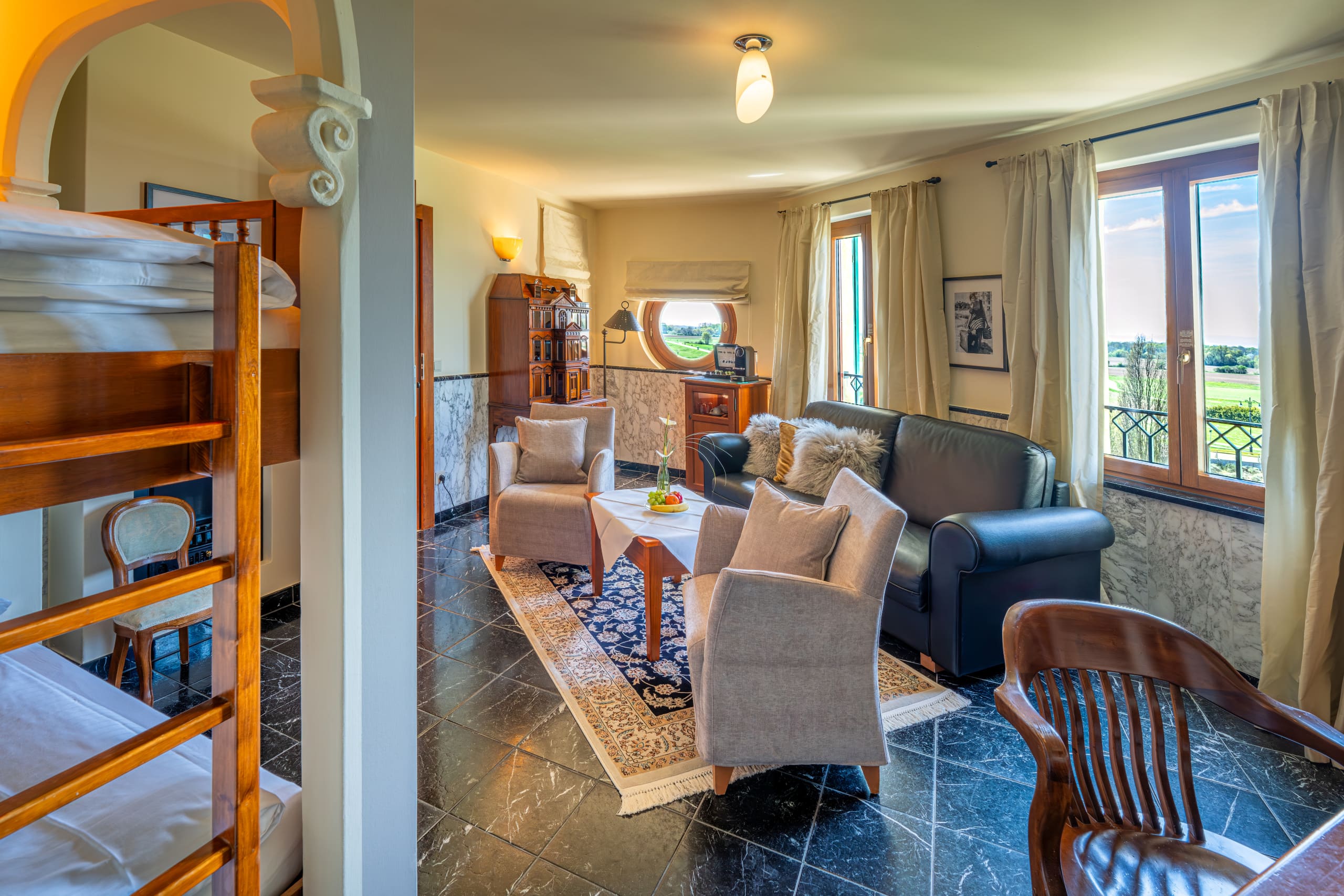 1 chambre à coucher avec lit double (1,80 x 2,00 m), 1 espace salon avec fauteuils/canapé et lit superposé (0,90 x 1,90 m), salle de bains avec douche et baignoire, WC séparé, enceinte Bluetooth, enceinte Bluetooth, 2 TV à écran plat, minibar inclus, machine à café, corbeille de fruits